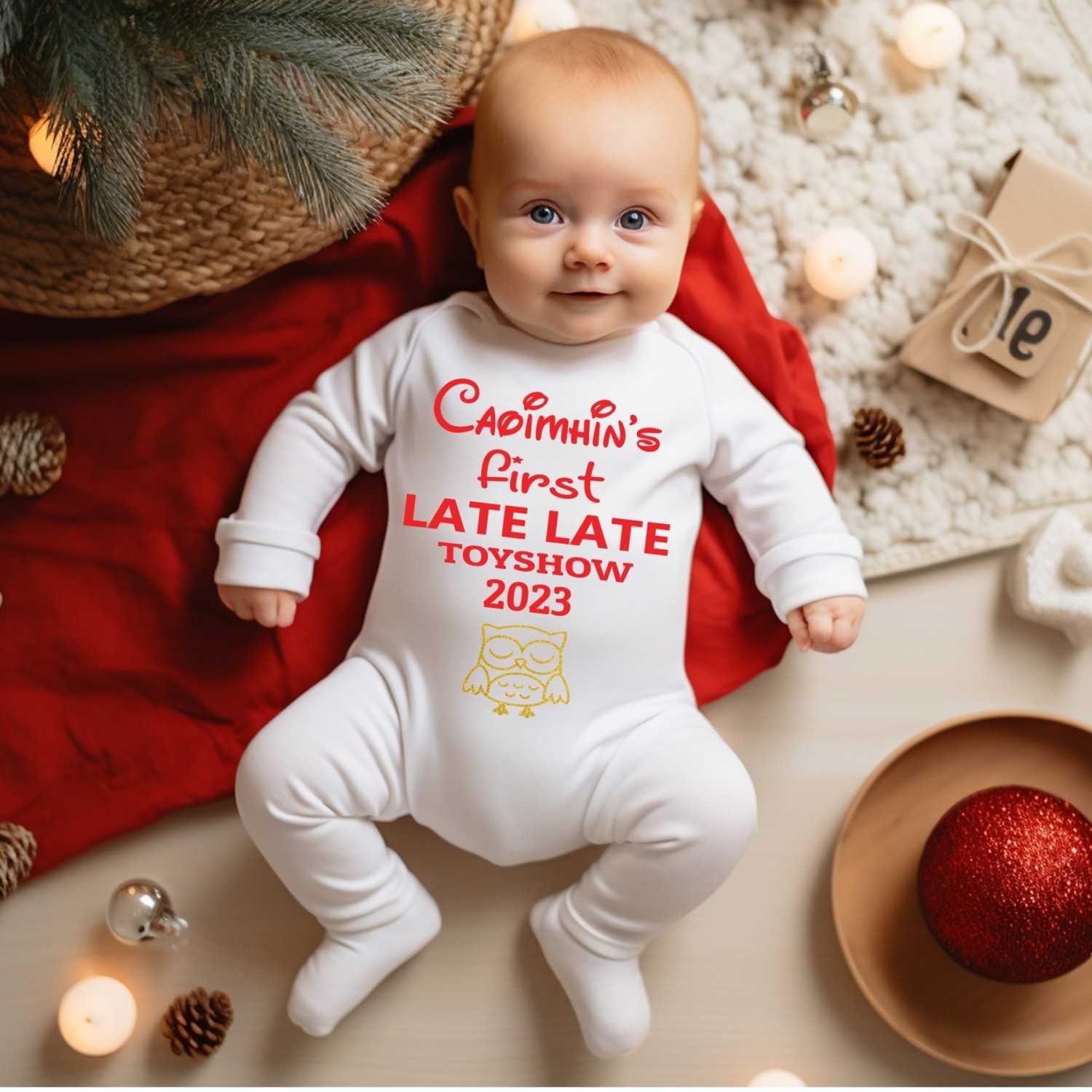 - 100% soft cotton white baby grow personalised with red and glitter gold design