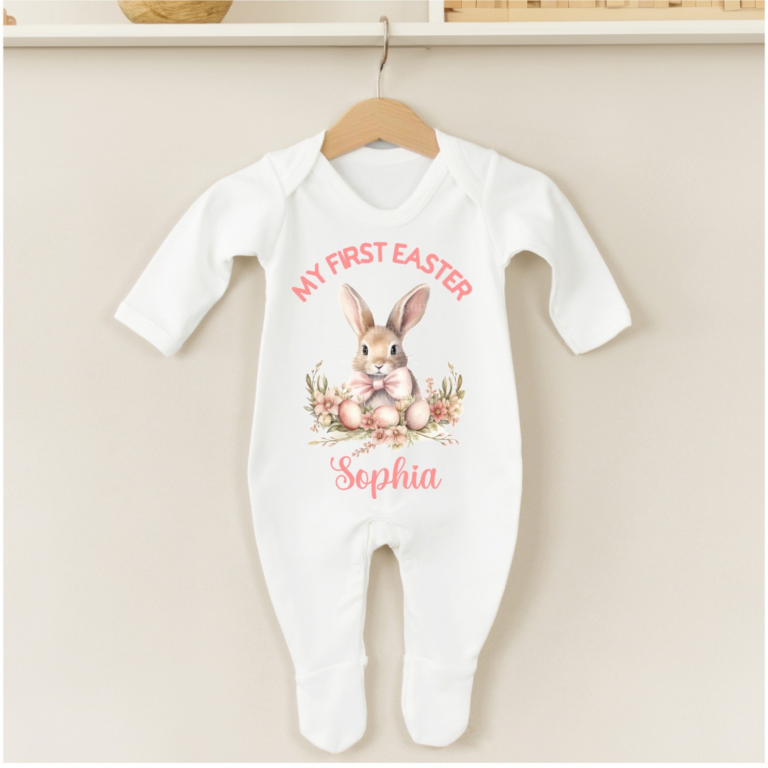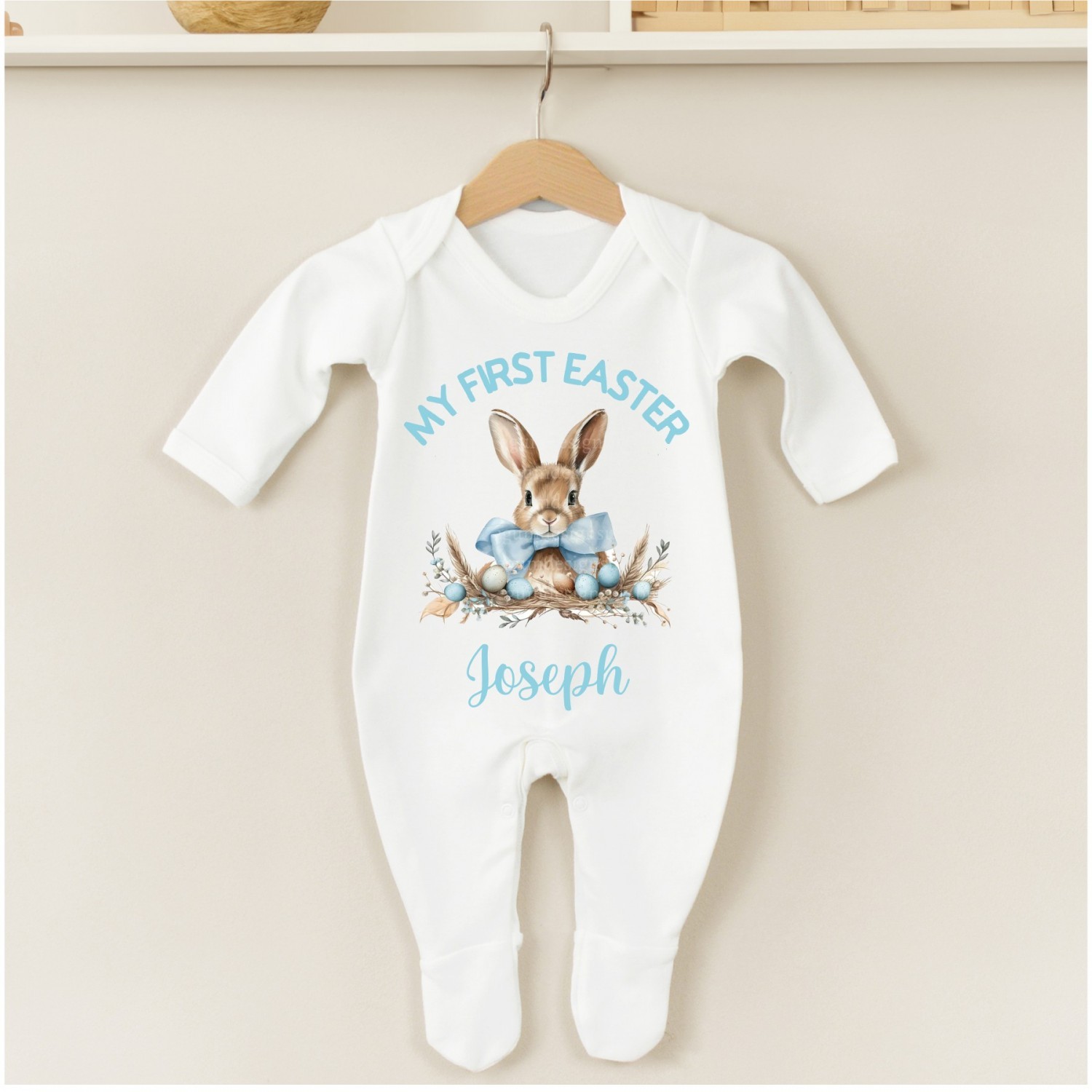 This beautiful personalised first Easter sleep suit makes the perfect outfit for a First Easter. It can be personalised with any name to make it extra special. This baby gift is great this Easter. The design features stunning water colour bunnies